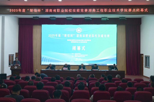 3月22日晚上,2025年“楚怡杯”湖南省职业院校技能竞赛高职地理空间信息采集与处理赛项、珠宝玉石鉴定赛项等两个赛项在湖南工程职业技术学院举行闭幕式。省派第一副主任、永州职业技术学院纪委书记宾柱元,地理空间信息采集与处理赛项省派赛项负责人、湖南工业职业技术学院教授颜浩龙,地理空间信息采集与处理赛项裁判长、湖南省地质地理信息研究所高级工程师史与正,珠宝玉石鉴定赛项裁判长、中南大学副教授刘晓文,学校党委副书记、校长陈志军出席闭幕式。学校党委委员、副校长陈翼翔主持闭幕式。
