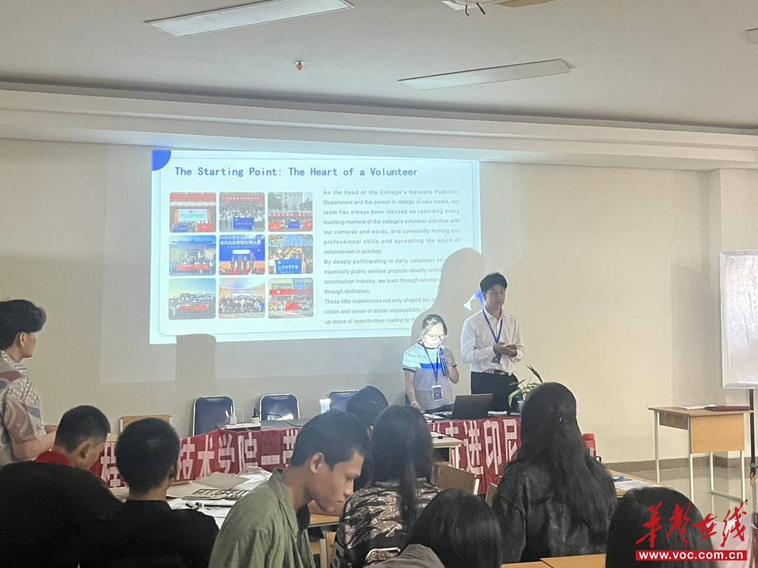 在印尼交流期间,两位学生以“从志愿服务之窗走向世界:中印尼青年友谊与成长之旅”为主题,为印尼学生带来了一场精彩的志愿服务分享会。曾捷从自己在“一带一路”研学项目中的志愿服务经历出发,讲述了如何通过志愿服务窗口,增进跨文化理解与友谊。“志愿服务不仅是付出,更是收获。通过服务他人,我们得以看见更广阔的世界,结识志同道合的国际友人。”他的分享赢得了在场学生的热烈掌声。