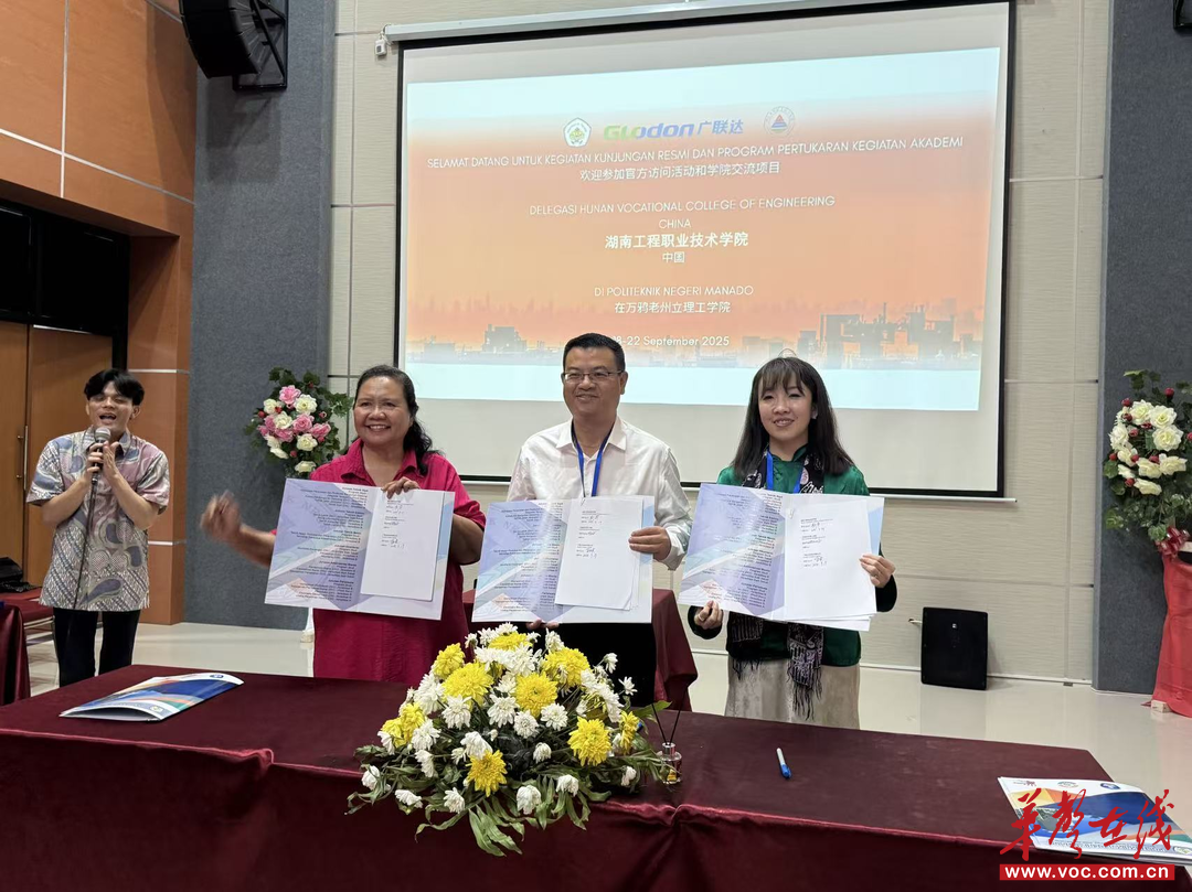 9月20日,湖南工程职业技术学院与印度尼西亚万鸦老州立理工学院合作签约仪式在万鸦老州立理工学院举行,标志着学校“职教出海”项目取得突破性进展,双高校建设成果系统性地输出至东南亚国家。实习实训中心主任彭华、工程管理学院院长何立志一行参加本次签约仪式。