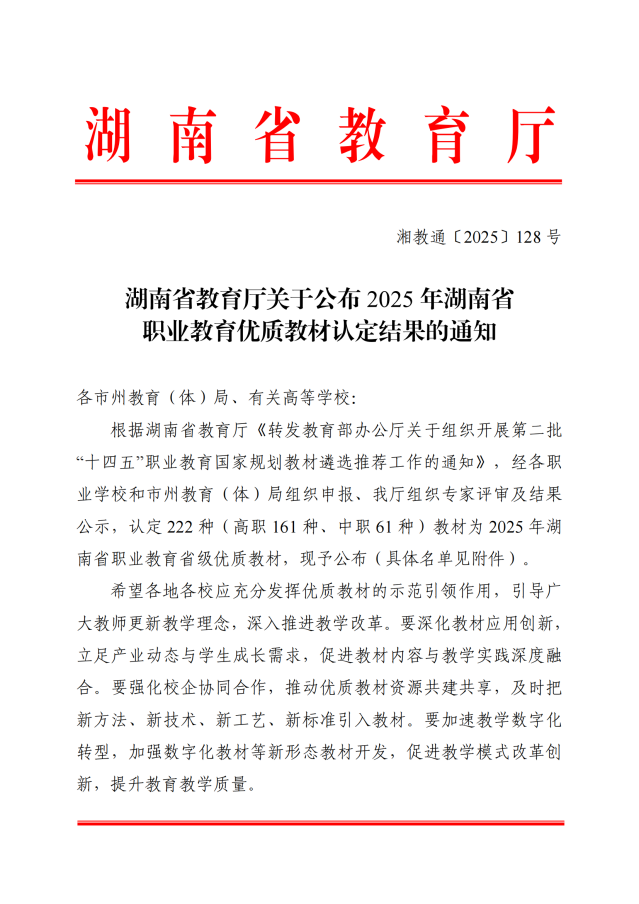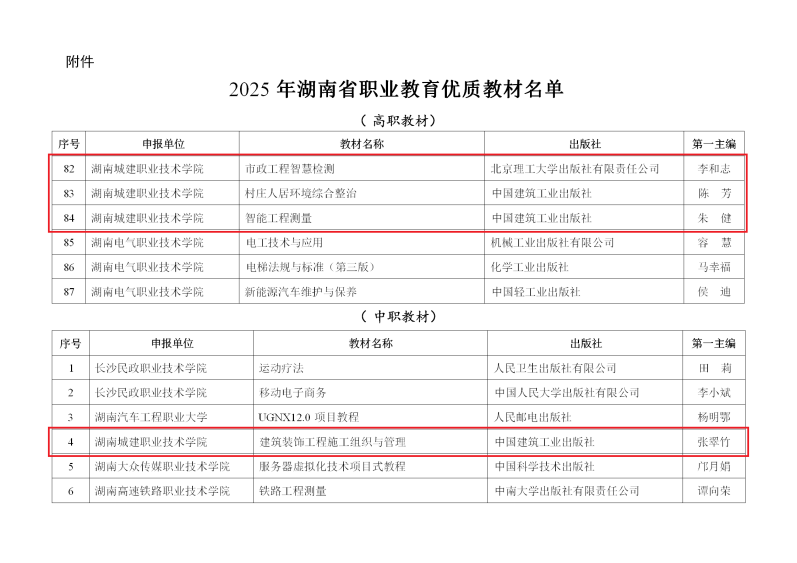 近日,湖南省教育厅公布了2025年湖南省职业教育优质教材认定结果,我院《市政工程智慧检测》(李和志)、《村庄人居环境综合整治》(陈芳)、《智能工程测量》(朱健)、《建筑装饰工程施工组织与管理》(张翠竹)共4部教材入选。
