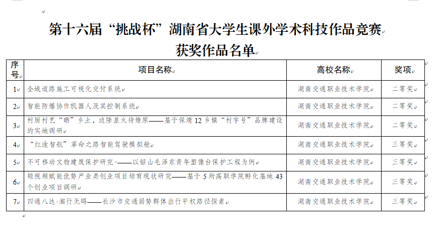 近日,由共青团湖南省委、省教育厅、省人力资源和社会保障厅、省科学技术协会、省学生联合会联合主办的第十六届“挑战杯”湖南省大学生课外学术科技作品竞赛决赛在邵阳学院圆满落幕。湖南交通职业技术学院选送参加省赛的7个项目全部获奖,其中,《全域道路施工可视化交付系统》《智能防爆协作机器人及其控制系统》《村厨村艺“晒”乡土,边陲星火待燎原——基于保靖12乡镇“村字号”品牌建设的实地调研》3个项目获大赛二等奖,《“红途智航”革命之路智能驾驶模拟舱》《不可移动文物建筑保护研究——以韶山毛泽东青年塑像台保护工程为例》等4个项目获大赛三等奖,为学院再添亮眼成绩单。