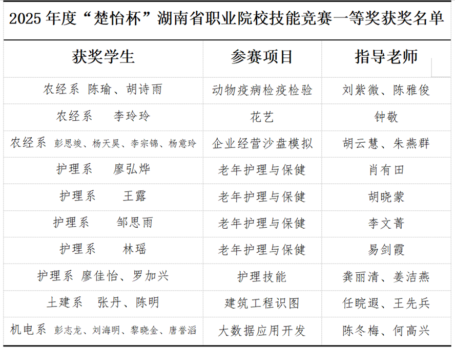 近日,2025年度“楚怡杯”湖南省职业院校技能竞赛圆满落幕。我院共派出53支队伍88人参加25个赛项的比赛。目前,51支队伍全部结束比赛,共获得一等奖10个,二等奖23个,三等奖12个,其中护理系获得5个一等奖,农经系获得3个一等奖,机电系获得1个一等奖,土建系获得1个一等奖,总体获奖率为88%。