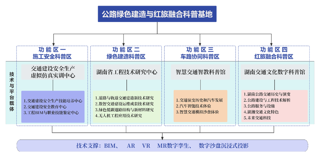 “公路绿色建造与红旅融合科普基地”以国家“双高计划”路桥高水平专业群为依托,构建了“两馆两中心”,形成了“红旅融合、车路协同、安全施工、绿色建造”四大特色科普区。