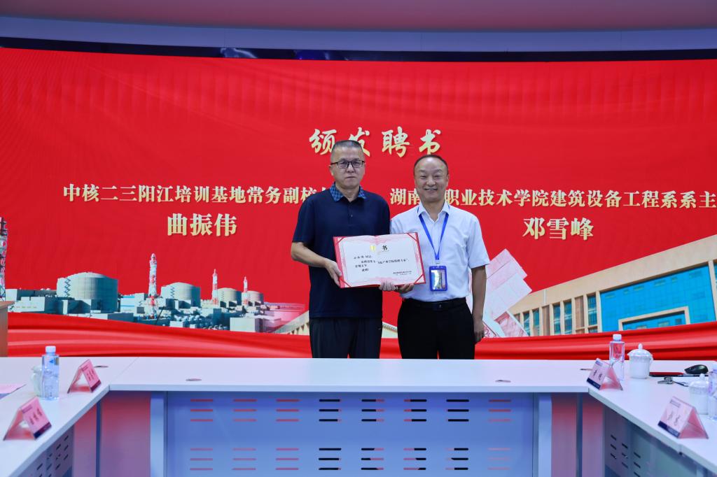 建筑设备工程系主任邓雪峰为曲振伟颁发“核电产业学院特聘专家”聘书